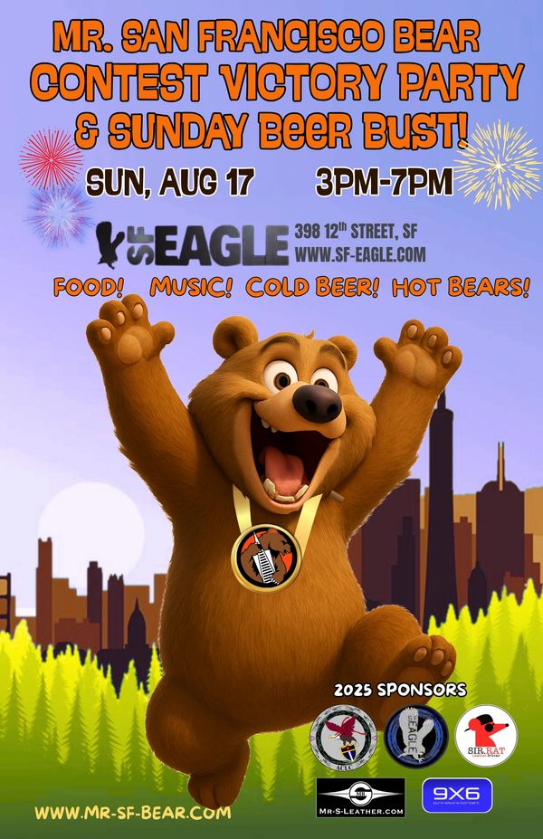 San Francisco Bear Weekend concludes with a furtastic Beer Bust at the historic SF Eagle. Join the contestants, judges, staff and producers of this year's events for a four-hour party complete with cold beer (or soft drinks), homemade food, great music and just the right number of sweaty bears to guarantee body contact as you move through the crowd. All this for $20 - with the proceeds going to the Alta California Leather Corps.