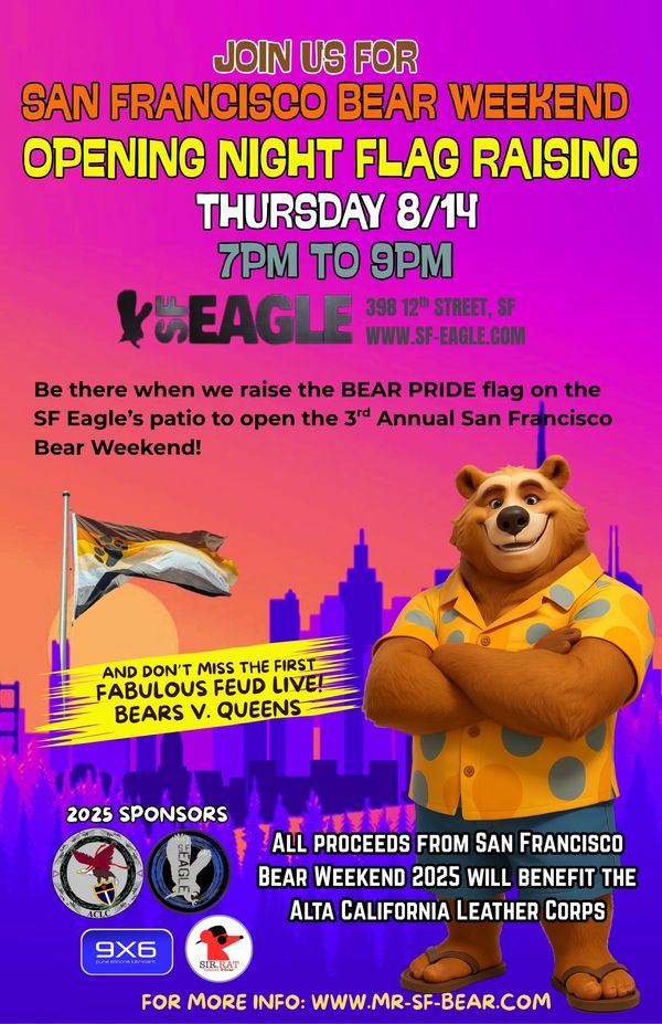 Join us at the SF Eagle for our traditional flag-raising ceremony as we hoist the Bear Pride flag over the bar's back patio.